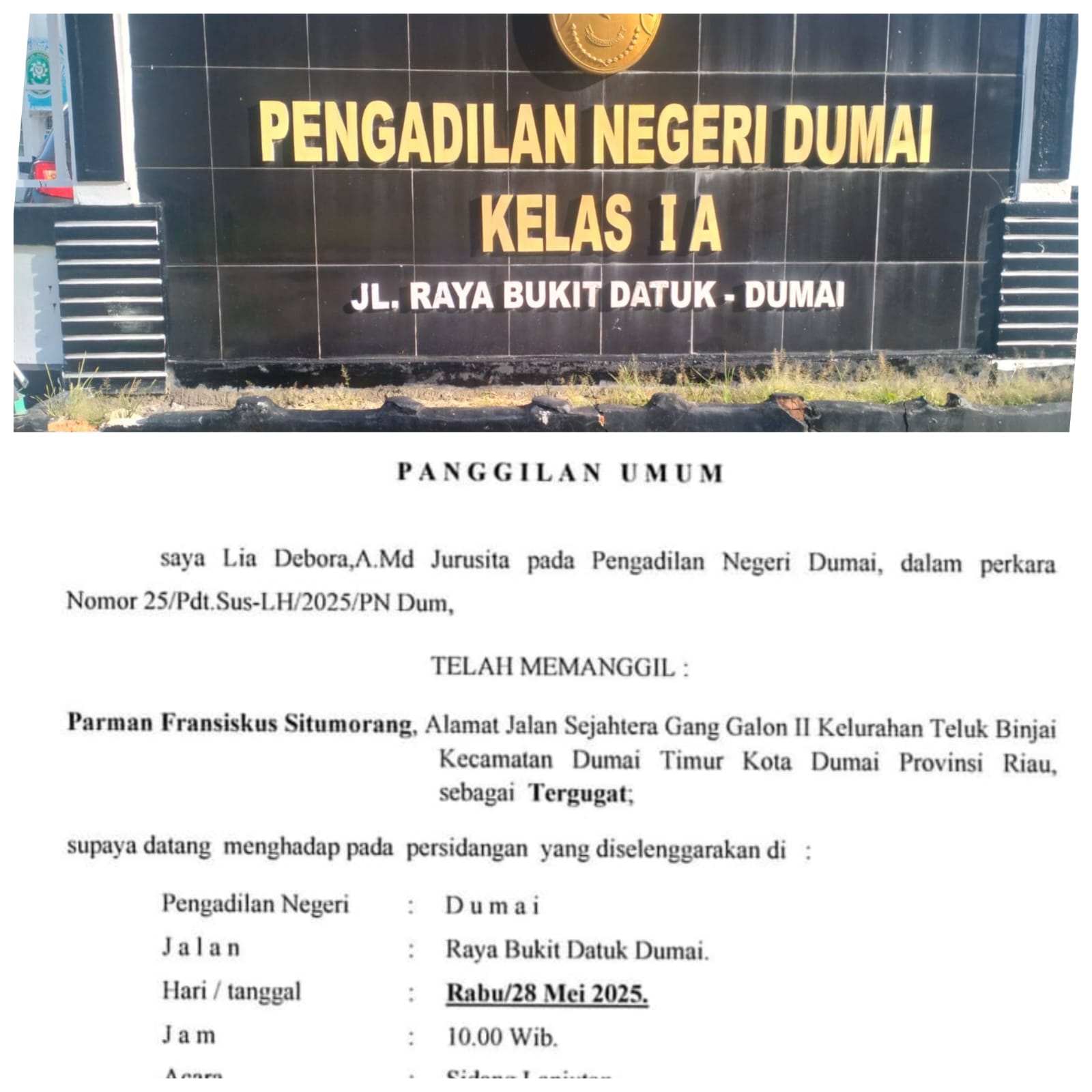 PN Dumai sudah melakukan panggilan secara patut tetapi sampai dengan saat ini Tergugat tidak pernah hadir dalam persidangan,”ungkap Batara Mulia Harahap,S.H Seketaris Jendral Aliansi Jurnalis Penyelamat Lingkungan Hidup.