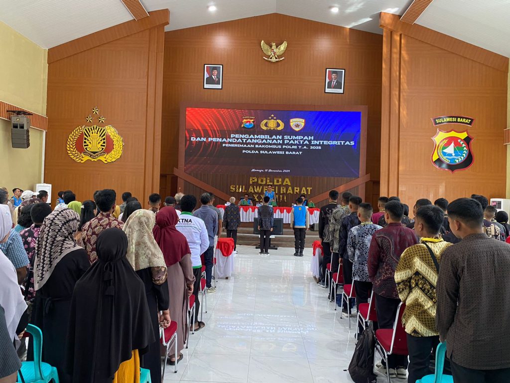Mediatargetbuser.id, Polda Sulbar – Sebagai komitmen awal untuk mengikuti proses seleksi Bakomsus Polri yang bersih, Transfaransi, Akuntabel dan Humanis (Betah), 96 calon peserta Bakomsus Polri Tahun Anggaran 2025 Polda Sulbar mengikuti pengambilan sumpah dan penandatanganan Pakta Integritas, Senin (17/11/24) di Aula Marannu Mapolda.