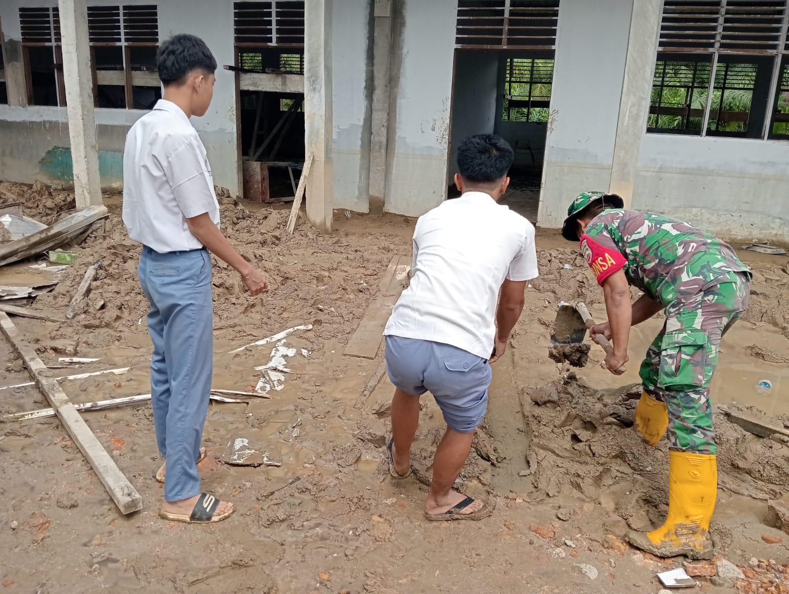Bersama dengan pihak sekolah setempat Kopda Narto panjaitan dan rekan rekan Babinsa Koramil 01/Barus dengan penuh semangat membersihkan lumpur dan kotoran yang ada di Lokasi sekolahan.meskipun kondisi masih dalam proses pemulihan pasca banjir , bersama sama kerja keras Babinsa memberikan harapan semangat baru bagi pihak sekolah .selain melakukan kegiatan pembersihan Babinsa juga memberikan himbauan kepada guru dan pelajar sekitar mengingatkan mereka untuk tetap waspada terhadap cuaca yang tidak menentu.himbauan tersebut di sertai dengan ajakan untuk tetap menjaga budaya peduli tentang lingkungan.