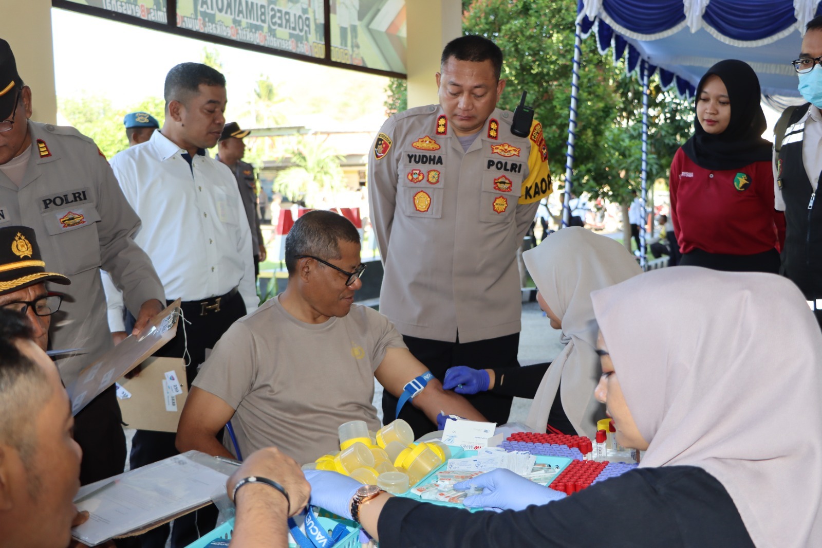 Pemeriksaan kesehatan diawali oleh Kapolres Bima Kota AKBP Yudha Pranata, diikuti oleh Waka Polres Bima Kota Kompol Herman dan seluruh pejabat utama (PJU) serta personel Polres Bima Kota secara berurutan.