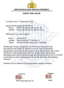 Targetbuser.id Lombok Timur, NTB – Kepolisian Resor Lombok Timur tengah menyelidiki dugaan penerbitan Surat Perintah Jalan (SPJ) bodong yang mencatut nama Kapolres Lombok Timur, AKBP I Komang Sarjana, SIK., SH. SPJ palsu ini diduga digunakan untuk memfasilitasi pengangkutan pupuk bersubsidi secara ilegal.