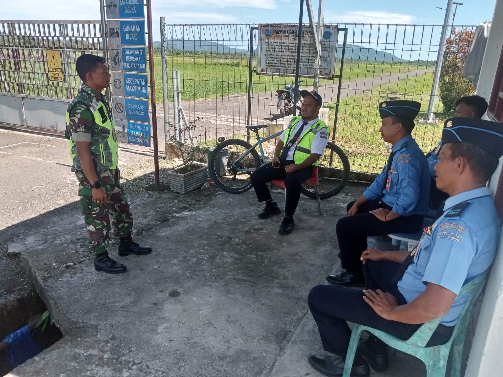 Tapteng-Meningkatkan kemanunggalan TNI, Babinsa Koramil 04/Pinangsori Kodim 0211/Tapanuli Tengah, Serka Mugi melaksanakan komunikasi sosial (Komsos) dengan petugas Avsec Bandar Udara Dr. FL Tobing, di wilayah binaan kel. Pinangsori Kec. Pinangsori, Kabupaten Tapanuli Tengah.Sabtu(23/08/2025).