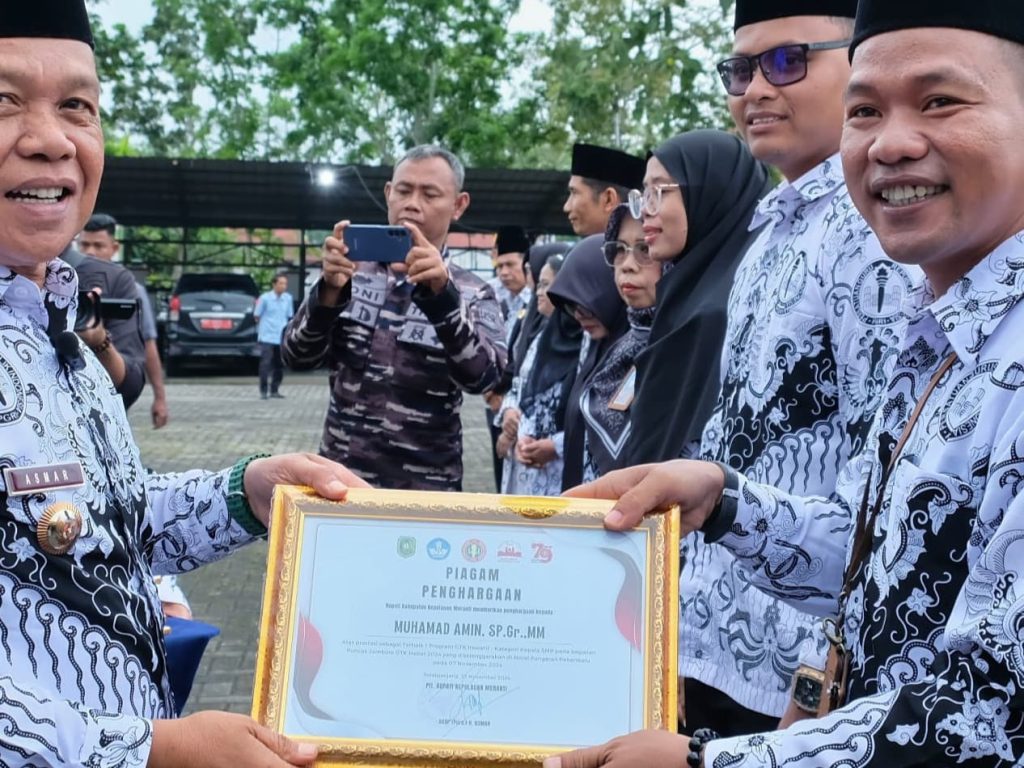 Usai pelaksanaan upacara, Plt Bupati Asmar beserta PGRI menyerahkan penghargaan kepada sejumlah guru berprestasi dalam ajang Jambore Guru dan Tenaga Kependidikan (GTK) Hebat dan apresiasi kepada Kandidat Sekolah Rujukan Google (KSRG).