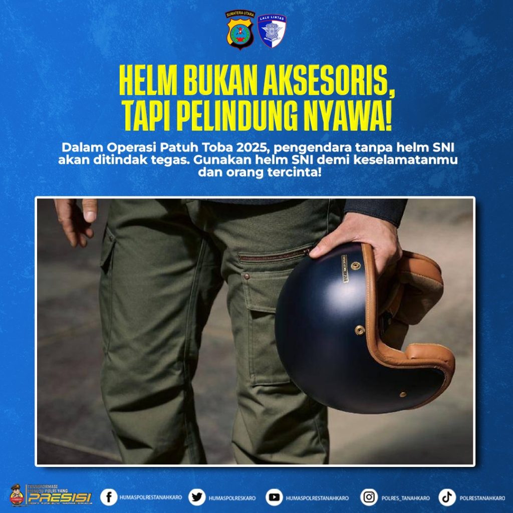 Media Target Buser Com,Tanah Karo (Sumut)-Dalam rangkaian Operasi Patuh Toba 2025, Satuan Lalu Lintas Polres Tanah Karo kembali mengingatkan pentingnya penggunaan helm standar nasional Indonesia (SNI) bagi pengendara dan penumpang sepeda motor. Helm bukan sekadar pelengkap gaya atau aksesoris semata, tetapi alat pelindung utama yang menyelamatkan nyawa saat terjadi kecelakaan.
