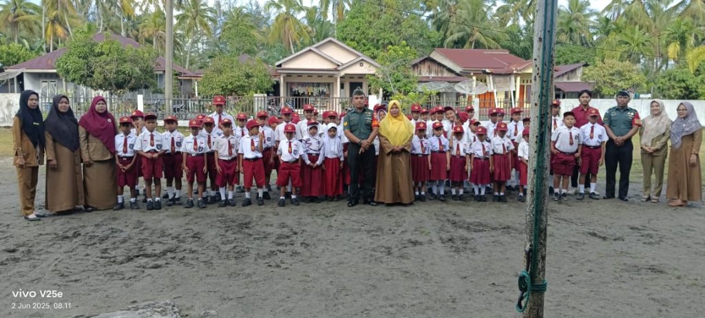 Tapteng_Suasana pagi di SDN.154510 Pasar Sorkam. Kec Sorkam.Barat. di penuhi dengan semangat Patriolisme dan disiplin yang kuat,pada kesempatan ini. Babinsa Koramil.02/Sorkam Serka. Mulyansen Sipayung. Sebagai Pembina Upacara, Senin( 05/05/2025).