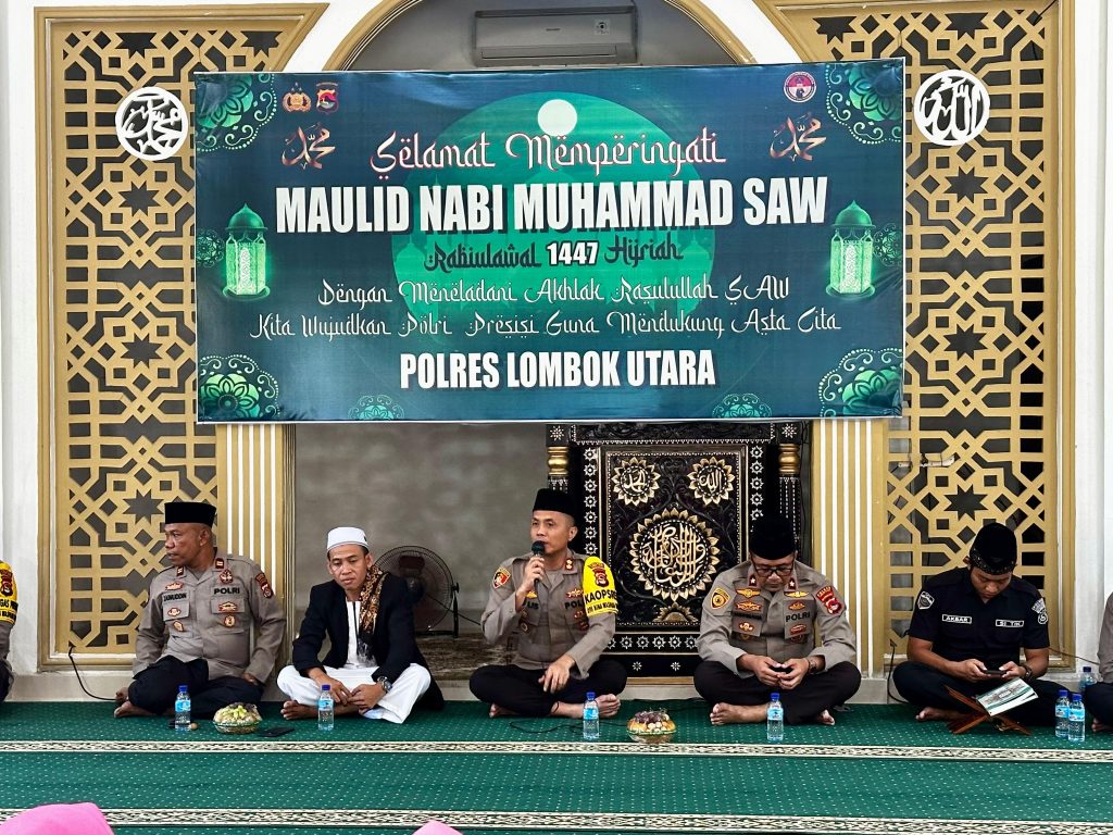 Targetbuser.id Lombok Utara – Kepolisian Resor (Polres) Lombok Utara menggelar peringatan Maulid Nabi Muhammad SAW 1447 Hijriah di Masjid Bhayangkara Polres Lombok Utara, Jumat (5/9/2025). Kegiatan yang mengusung tema “Dengan meneladani Akhlak Rasulullah Kita Wujudkan Polri Presisi guna mendukung Asta Cita” ini dihadiri Kapolres Lombok Utara AKBP Agus Purwanta, S.I.K., Ketua Bhayangkari Cabang Lombok Utara Ny. Heny Agus Purwanta, pejabat utama, personel, pengurus Bhayangkari, tokoh agama, serta masyarakat setempat.